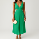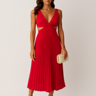 هذا الفستان المطوي الأنيق يقدم قصة ضيقة عند الخصر وتنورة واسعة تبرز القوام. يضيف خط العنق على شكل V لمسة من الرقي والأناقة. مثالي للمناسبات المسائية أو المناسبات الخاصة.