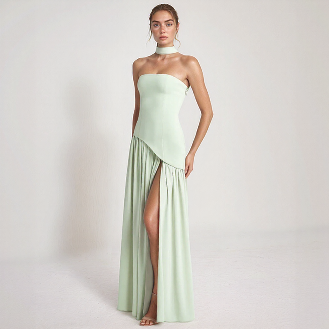 هذا الفستان الطويل يُبرز القوام بفضل كورسيه مُهيكل وبدون حمالات. الشق الجانبي يضيف لمسة من الأنوثة والثقة. مثالي للمناسبات الأنيقة، يجمع بين الجاذبية والراحة.