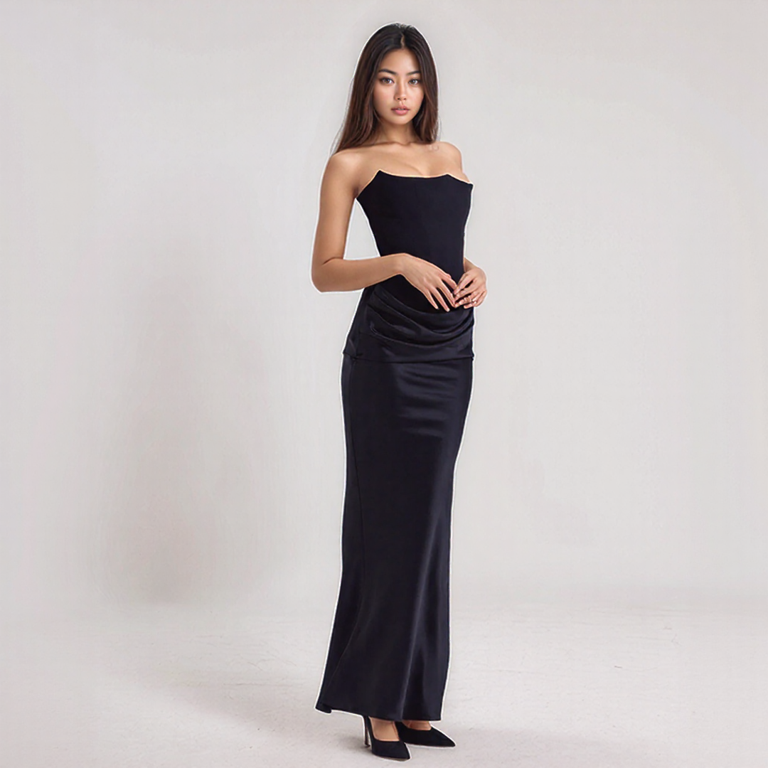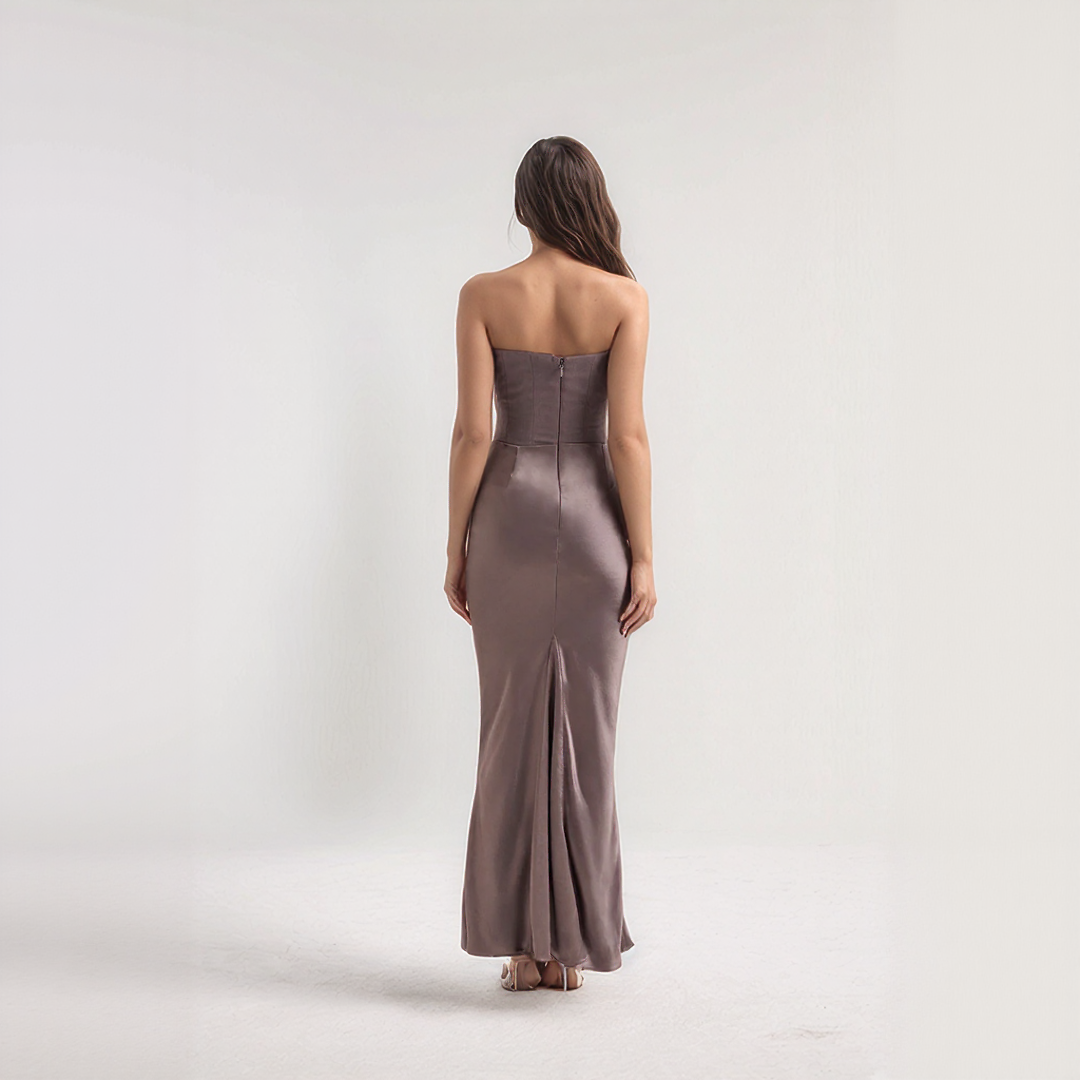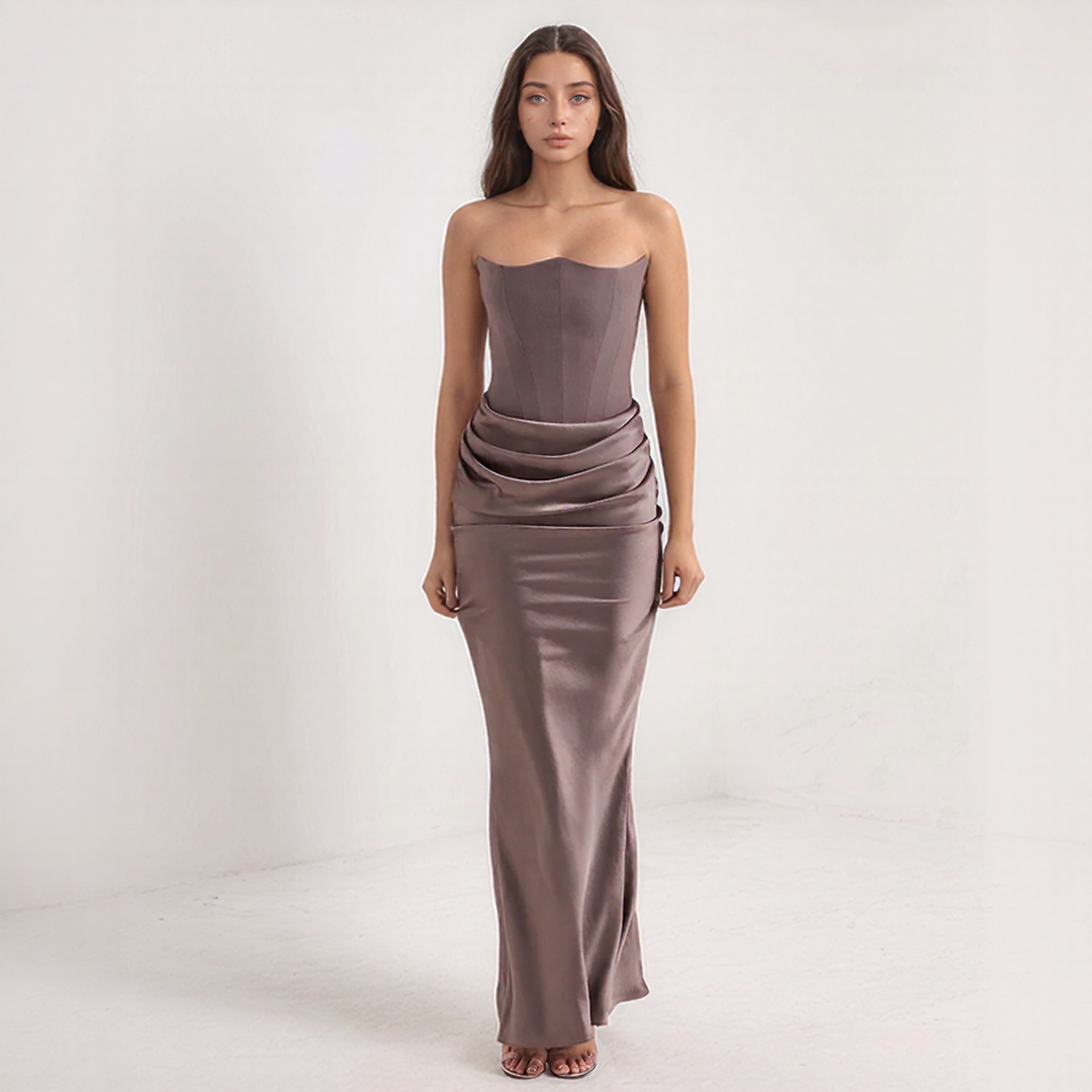 تُبرز هذه الفستان الكورسيه الأنيق القوام بفضل الجزء العلوي الهيكلي. تصميمه بدون حمالات وقصته السائلة تضيف لمسة من الرقي الطبيعي. مثالي للمناسبات الرسمية والسهرات الأنيقة.