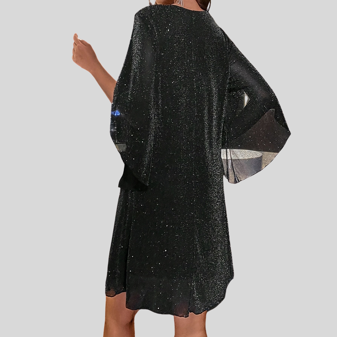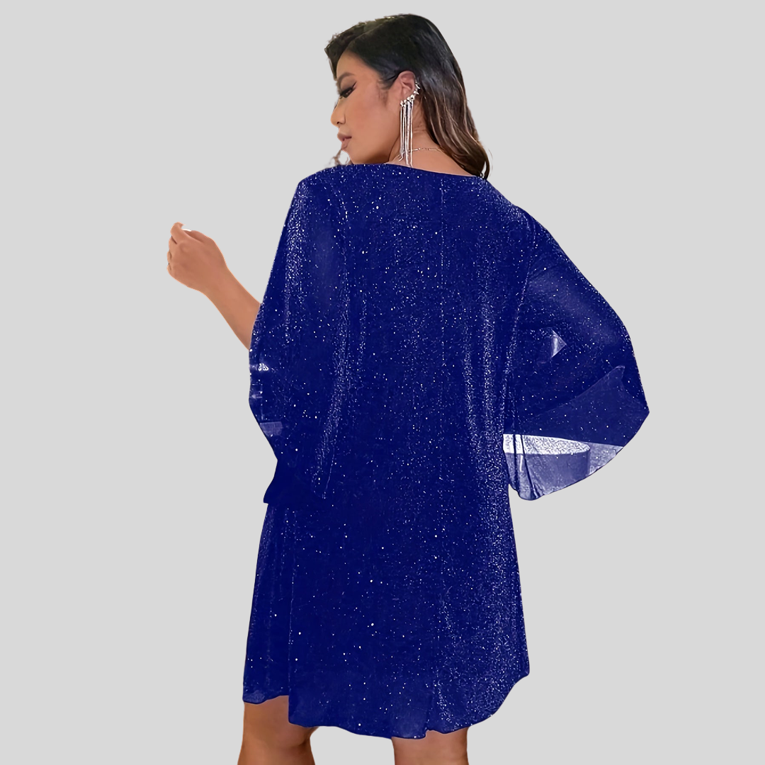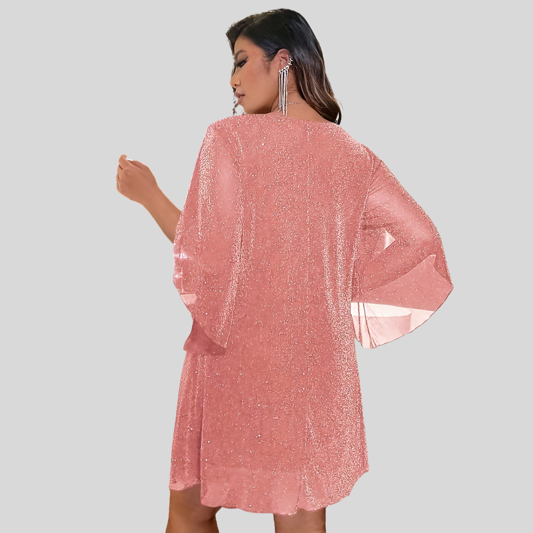 فستان قصير لامع مثالي لسهرتك. يبرز تصميمه على شكل حرف V قوامك. متوفر بعدة ألوان وأحجام.