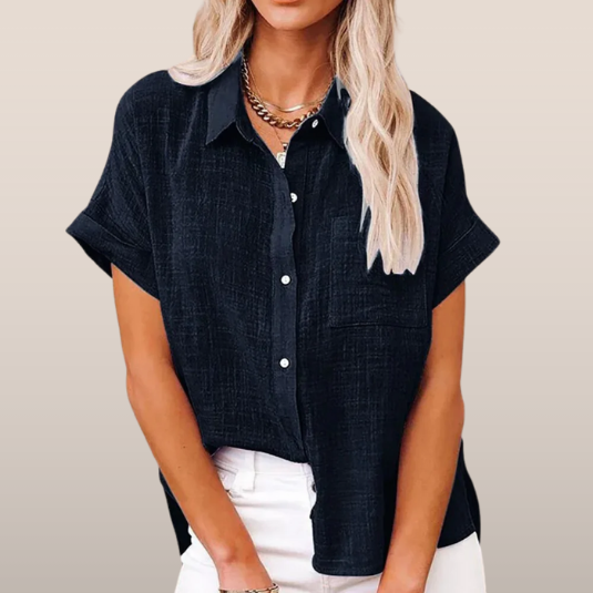 تقدم هذه البلوزة تصميمًا واسعًا مثاليًا للأيام الحارة. يضيف ياقة الكلاسيكية وإغلاق الأزرار لمسة أنيقة. مثالية لمظهر غير رسمي أو مهني.