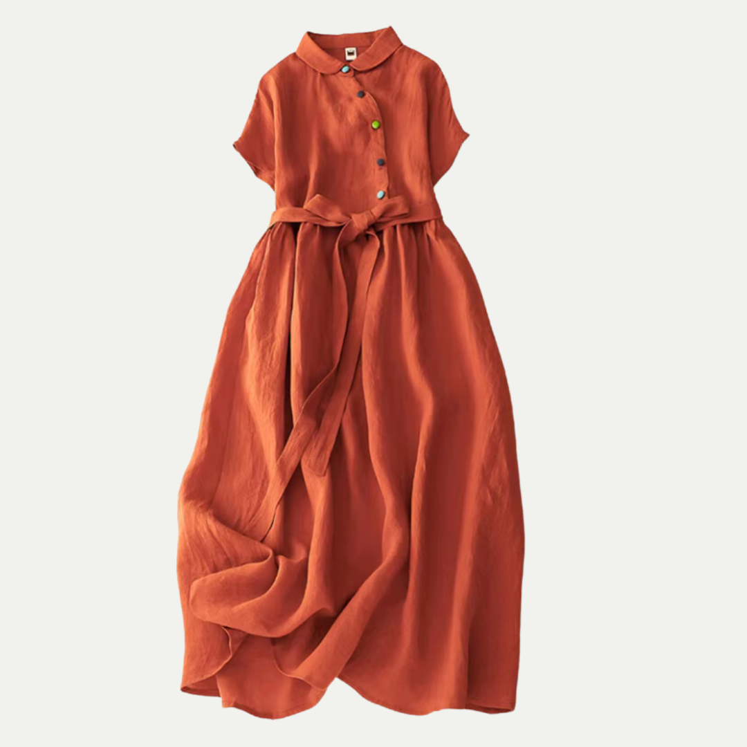 Tato dlouhá šaty okouzlují svou lichotivou siluetou a designem inspirovaným vintage stylem. Pohodlné a prodyšné, nosí se snadno v každém ročním období. Jejich jemné knoflíky a pečlivé zpracování dodávají nádech nadčasového kouzla, hodného románu z doby.