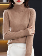 Denne sweater fremhæver silhuetten med sin rullekrave og tætsiddende pasform. Den glider nemt under en jakke eller frakke for at skabe pæne outfits i enhver sæson. Dens enkle stil gør det muligt at kombinere den med både en nederdel og et par bukser for varierede looks.
