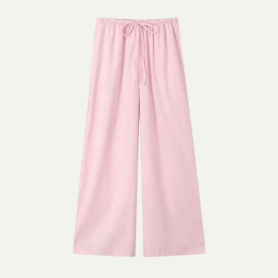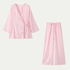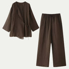 Αυτό το σετ συνδυάζει ένα πουκάμισο στυλ κιμονό με φαρδιά μανίκια και ένα παντελόνι ψηλής μέσης με φαρδιές γραμμές για μια ρευστή και κομψή εμφάνιση. Ελαφρύ και άνετο, είναι ιδανικό για ζεστές ημέρες. Διαθέσιμο σε πολλές αποχρώσεις, συνδυάζει καλοκαιρινό στυλ και ελευθερία κινήσεων.