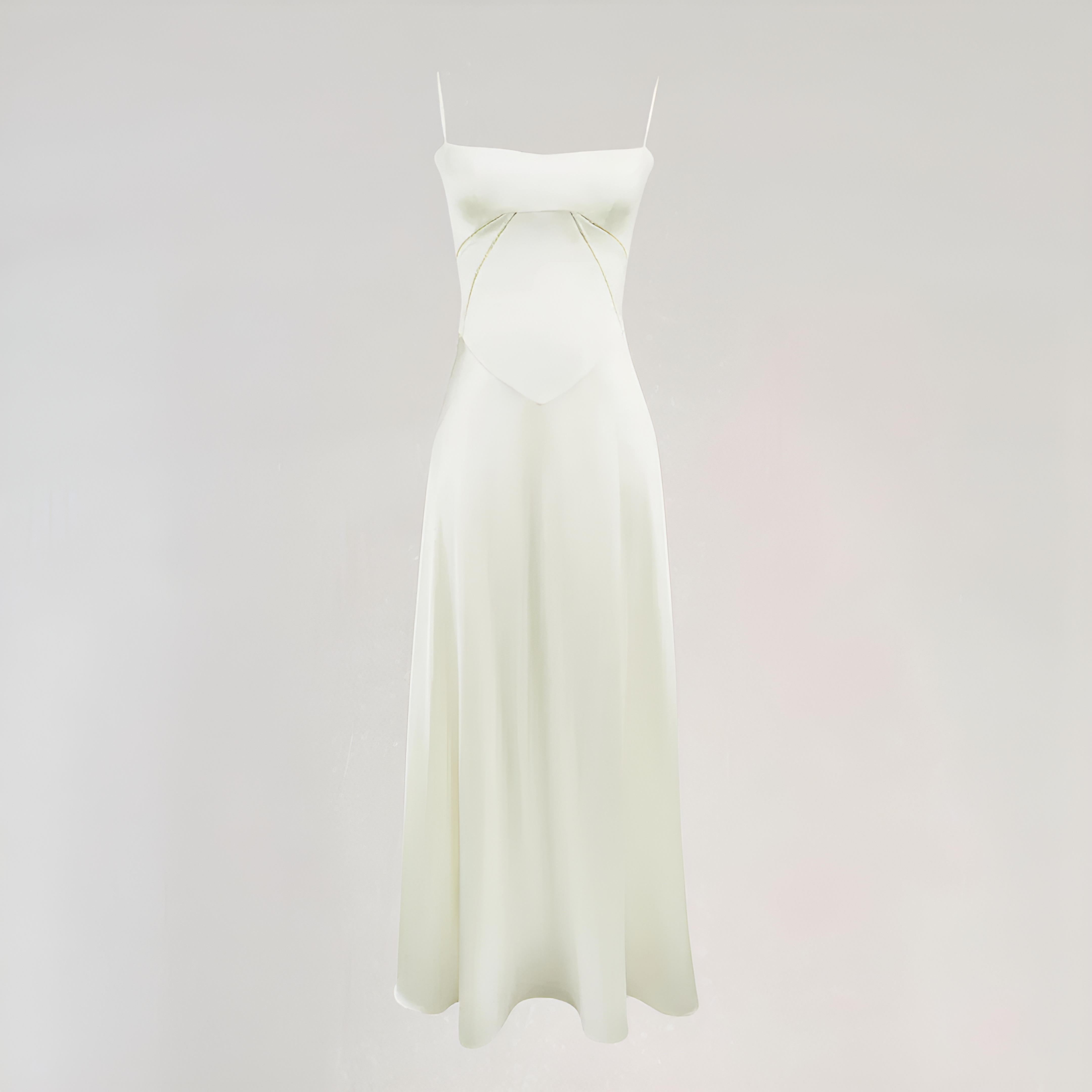 Αυτό το μακρύ φόρεμα αναδεικνύει τη σιλουέτα χάρη στο μπούστο του σε στυλ κορσέ που τονίζει διακριτικά τη μέση. Η ρευστή του γραμμή προσφέρει κίνηση και χάρη, ενώ η πλάτη με κορσέ προσθέτει μια ρομαντική και δομημένη πινελιά. Ιδανικό για βραδιές, γκαλά ή τελετές.