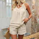 Αυτό το αμάνικο σύνολο με V-λαιμό είναι η ιδανική συνδυαστική επιλογή άνεσης και κομψότητας με ρευστή γραμμή. Ιδανικό για τις καλοκαιρινές μέρες, προσφέρει μια χαλαρή και στυλάτη εμφάνιση με απλότητα.