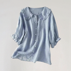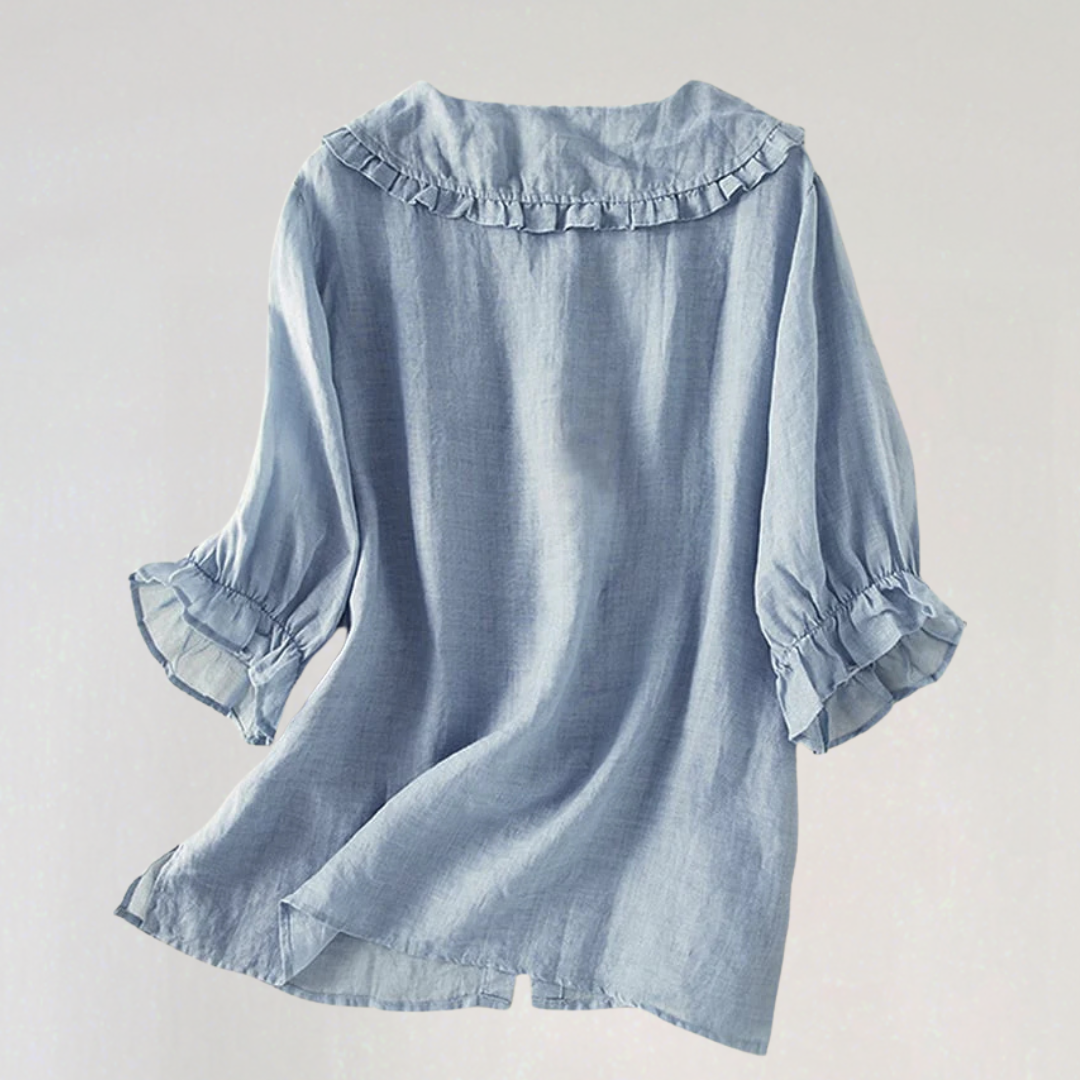 Αυτή η ελαφριά μπλούζα διαθέτει ένα κομψό κολάρο με βολάν και μισά μανίκια για μια χαλαρή καλοκαιρινή εμφάνιση. Η φαρδιά της γραμμή εξασφαλίζει άνεση καθ' όλη τη διάρκεια της ημέρας. Ιδανική για διάφορες περιστάσεις, συνδυάζεται εύκολα με διαφορετικά παντελόνια.