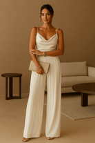 This jumpsuit embodies the meeting of sophistication and comfort. Its fluid cut elongates the silhouette, while its clean design adds a contemporary touch. Ideal for dressed-up events or stylish outings, it is easy to wear and can be enhanced in the blink of an eye with your favorite accessories.
