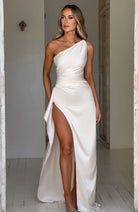This one-shoulder evening gown seduces with its elegant asymmetrical cut. Its flattering drape and high slit subtly reveal the leg for a glamorous look. Ideal for shining during your most beautiful evenings.