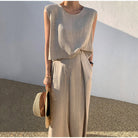 סט זה כולל מכנסיים רחבים וחולצה עם צווארון עגול. החיתוך הרחב מבטיח חופש תנועה יוצא דופן. זמין בכמה צבעים אלגנטיים.