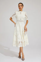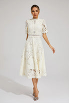 שמלה זו מציגה דגשים עם מראה עדין וסילואט מידי מחמיא. מושלמת לחתונות, מסיבות גן או ערבים אינטימיים. היא מגלמת את מהות הגלאמור העדין.