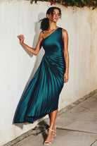 このロングイブニングドレスは、片方のストラップの大胆なカットと繊細なプリーツ生地で魅了します。フィット感のあるウエストがエレガントにシルエットを引き立て、一方で流れるような仕上げが洗練された印象を与えます。正式なイベントや特別な夜のために輝くのに最適です。