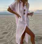 このエレガントなシャツドレスは、高いスリットとボタンディテールを備え、モダンなシルエットを提供します。さまざまなシーンに最適で、スタイルと快適さを兼ね備えています。
