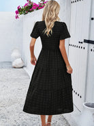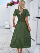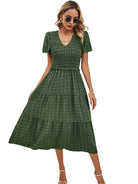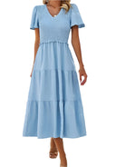 この短袖のボヘミアンシックなドレスは、カジュアルでありながらエレガントなルックに最適です。スモックウエストがシルエットを引き立て、流れるようなカットが快適さを保証します。夏のお出かけや晴れた日のために完璧です。