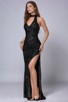 このロングイブニングドレスは、きらめくスパンコールと大胆なハイスリットで魅了します。構造的なVネックとフィット感のあるカットが、洗練されたシルエットを引き立てます。特別な夜に輝くためにデザインされたグラマラスな一着です。