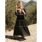 Denne lange svarte kjolen har en flytende passform og en flatterende V-hals. Perfekt for ulike arrangementer, den kombinerer komfort og stil.