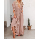 Denne lange, flytende kjolen gir en elegant og avslappet silhuett. Den dype utringningen fremhever silhuetten. Perfekt for solfylte dager eller sommerkvelder.