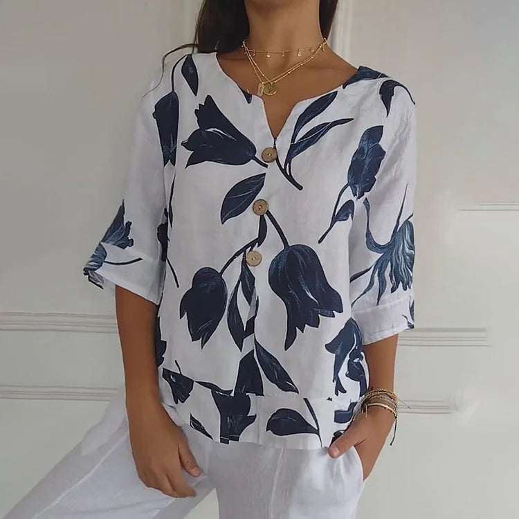 Jeanne | Elegant Blomstret Bluse – Sentral Knapping Og Korte Ermer