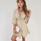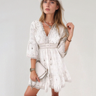 Ta krótka sukienka zachwyca swoim korzystnym dekoltem w kształcie litery V oraz rozszerzanymi rękawami, które dodają lekkości. Delikatne hafty podkreślają jej bohemyjski i autentyczny charakter. Luźny krój zapewnia optymalny komfort i idealną swobodę ruchów na słoneczne dni.