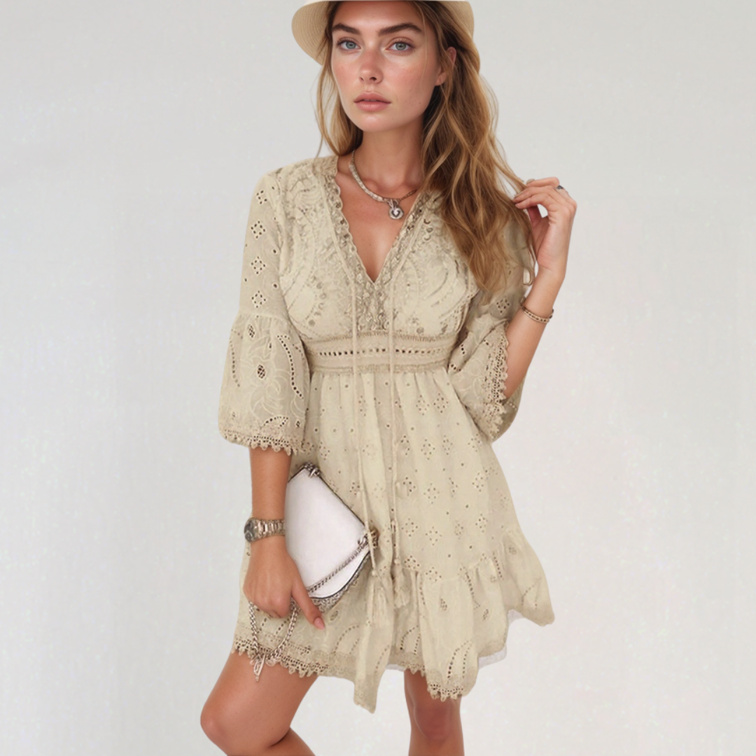 Ghislaine | Krótka Sukienka Boho – Delikatne Hafty i Kołnierz V